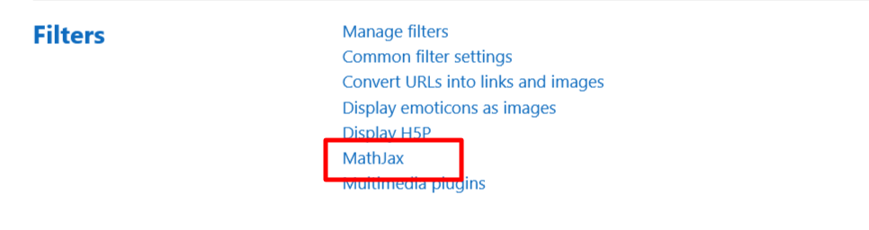 First, navigate to Site administration -> Plugins -> Filters -> MathJax.